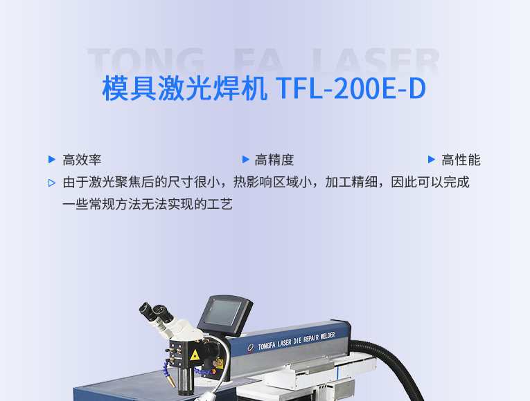 出口型模具激光焊機(jī)是通發(fā)激光公司專門為出口國(guó)外客戶使用而設(shè)計(jì)的系列機(jī)型TFL-200E-D,配置激光頭電動(dòng)升降,同時(shí)配置操縱桿無(wú)極調(diào)速控制XY橫向和縱向電動(dòng)移動(dòng)。適用于各類精密注塑模具、壓鑄模具等模具激光修補(bǔ)焊接;同時(shí)也適合鑄件沙孔激光修補(bǔ)、模具崩缺激光修復(fù)、過(guò)切加工等的激光修補(bǔ);各類金屬結(jié)構(gòu)件、金銀首飾的激光焊接加工。