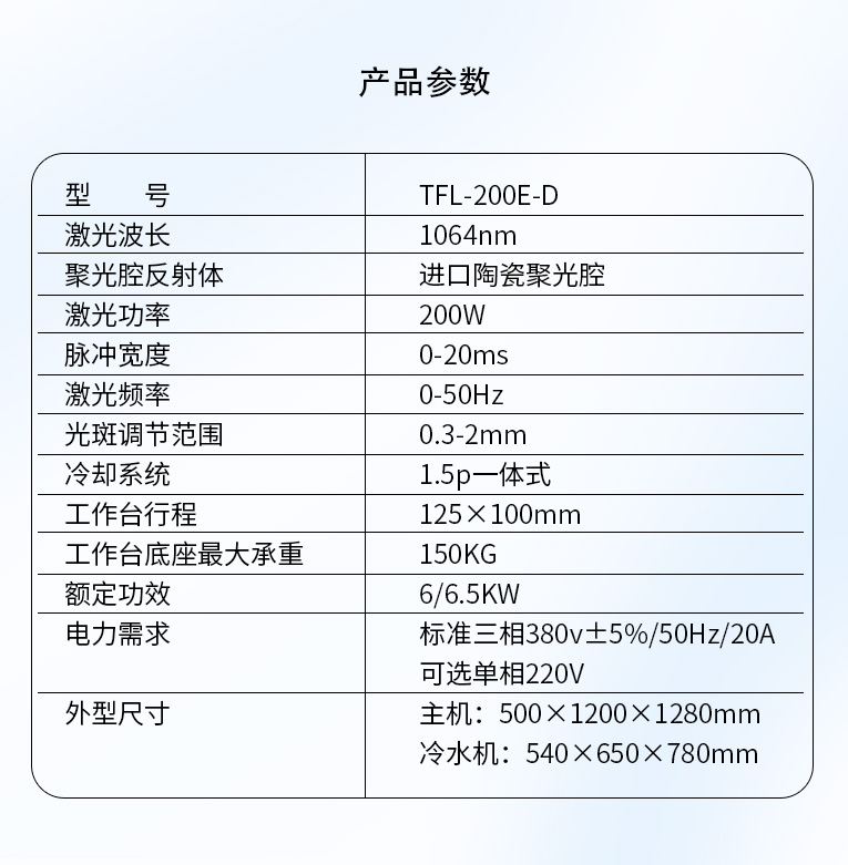 環(huán)境溫度:攝氏4度-攝氏32度。設(shè)備運(yùn)行時(shí),環(huán)境溫度不可以超過(guò)攝氏32度,因?yàn)榧す怆娫床糠郑β屎芨撸恍┕β势骷\(yùn)行時(shí)發(fā)出熱量需要及時(shí)散發(fā)出去,而環(huán)境溫度太高會(huì)導(dǎo)至不能正常散熱,會(huì)引起整個(gè)系統(tǒng)的工作不穩(wěn)定,甚至損壞。而冬天的時(shí)候,需要嚴(yán)防冷卻水結(jié)冰,因?yàn)榧す饩w、氙燈、聚光腔都充滿了水,結(jié)冰會(huì)直接導(dǎo)致這些器件的損壞。冬天時(shí)如長(zhǎng)時(shí)間不運(yùn)行情況下,將腔內(nèi)的水排空;如再開機(jī)前,先重新加水,打開電源空氣開關(guān),先行主機(jī)不開,只開水機(jī)空機(jī)運(yùn)行10分鐘,等水溫回復(fù)到攝氏4 度以上,再開主機(jī)。(強(qiáng)烈要求不能將設(shè)備放于室外或者低溫結(jié)冰的情況下使用,否則極易損壞設(shè)備)