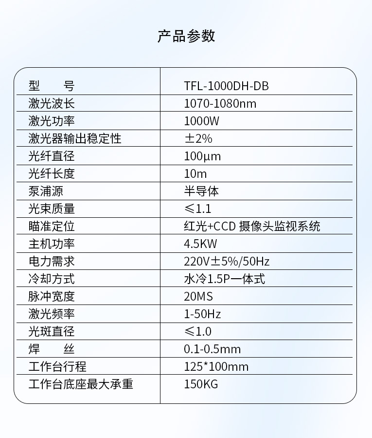 采用光纖激光器,反射率高,能量強,免維護,免調光,功耗少,相比傳統 模具焊來說,體積小,安全,穩定性好超長使用壽命。 1000W光纖激光器,滿足銅、鋁焊接量大的模具及產品焊接加工需要。 高承重底座及工作臺,保持輕便靈活的優點,同時提供更高承載能力。 配備.1.5P大功率一體式水冷水機,保證了大功率焊接的穩定性。
